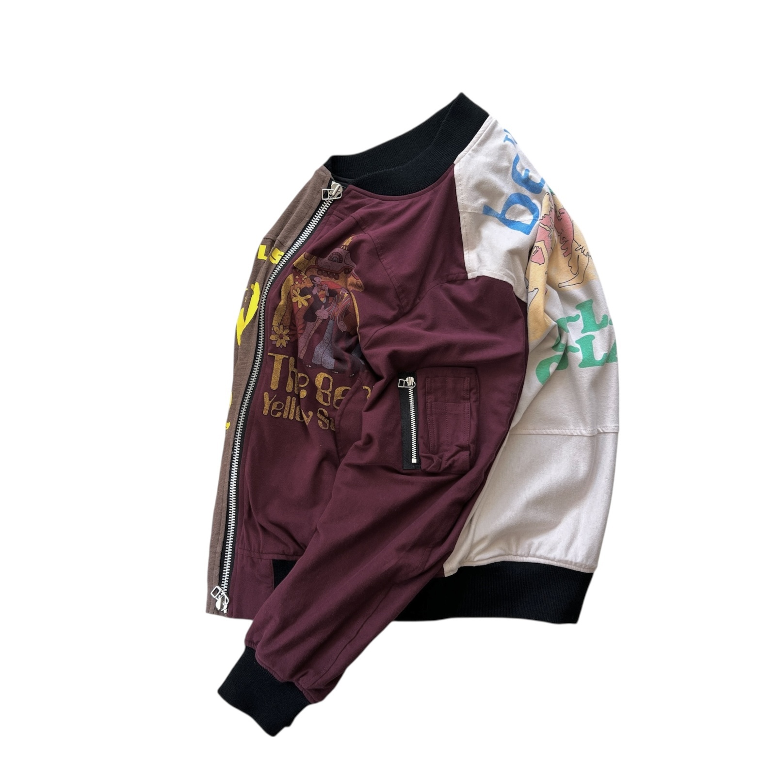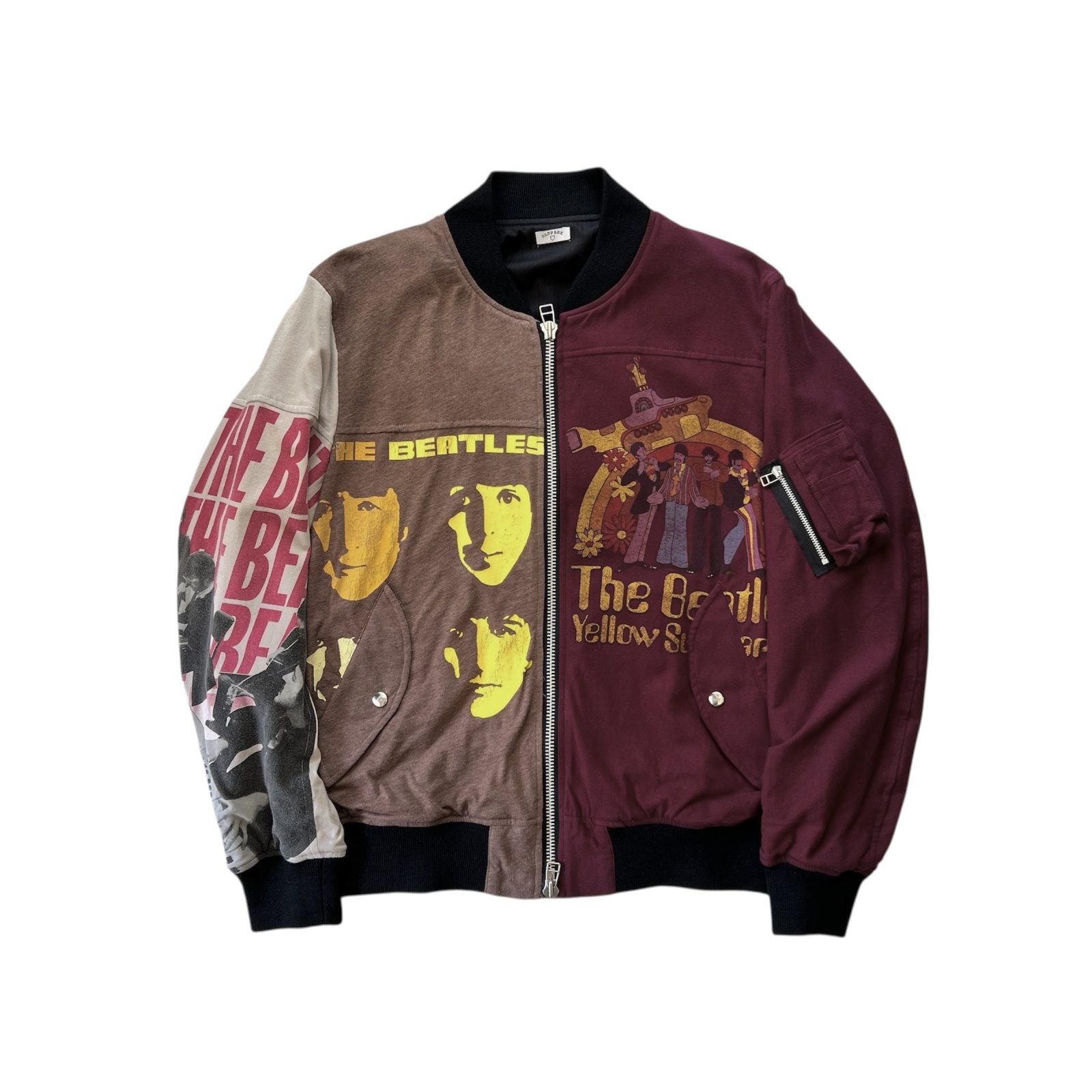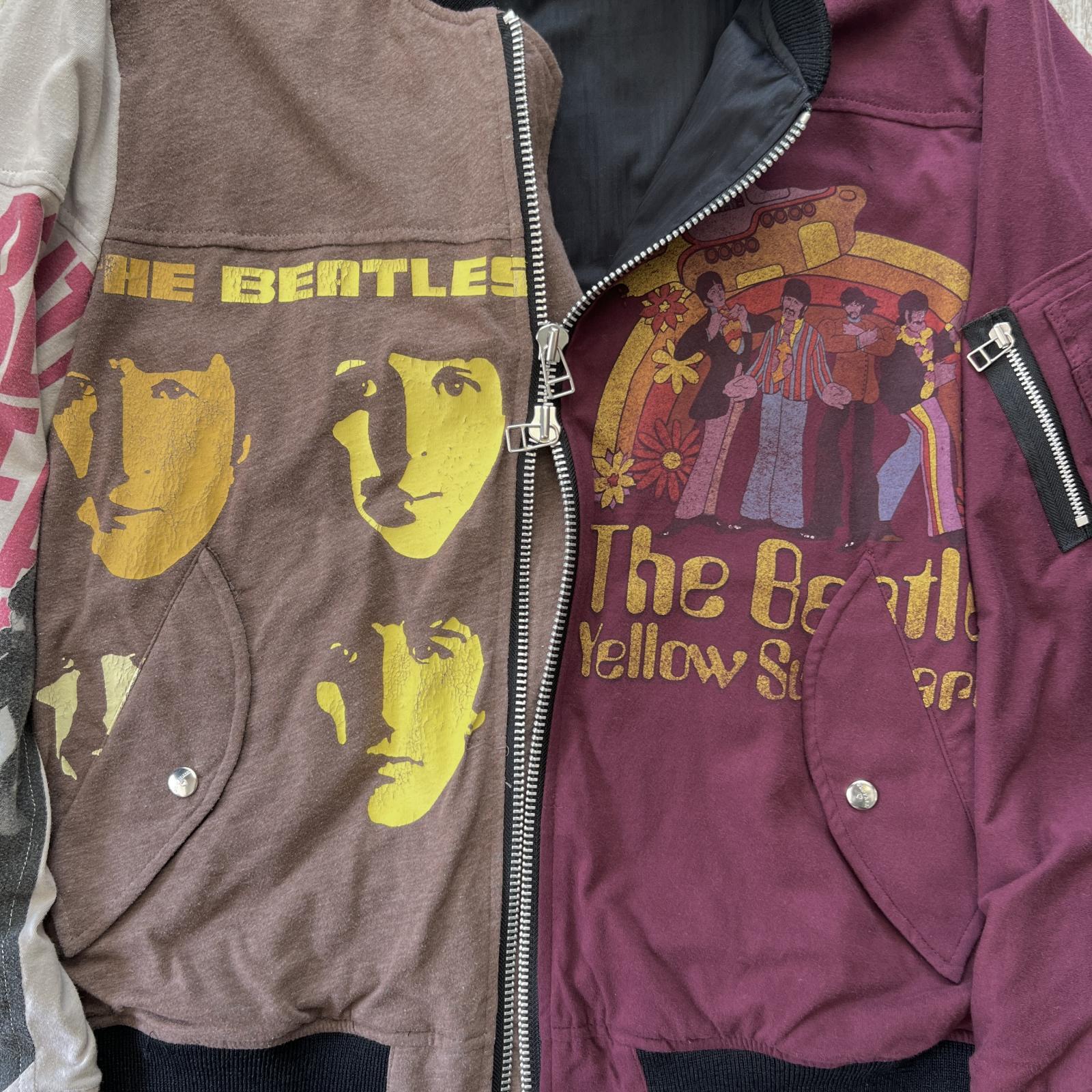 OLDPARKの flight jacket tee は、古着のバンドTシャツを一度解体し、パッチワークデザインで再構築されたユニークなリメイクアウターウェアです。