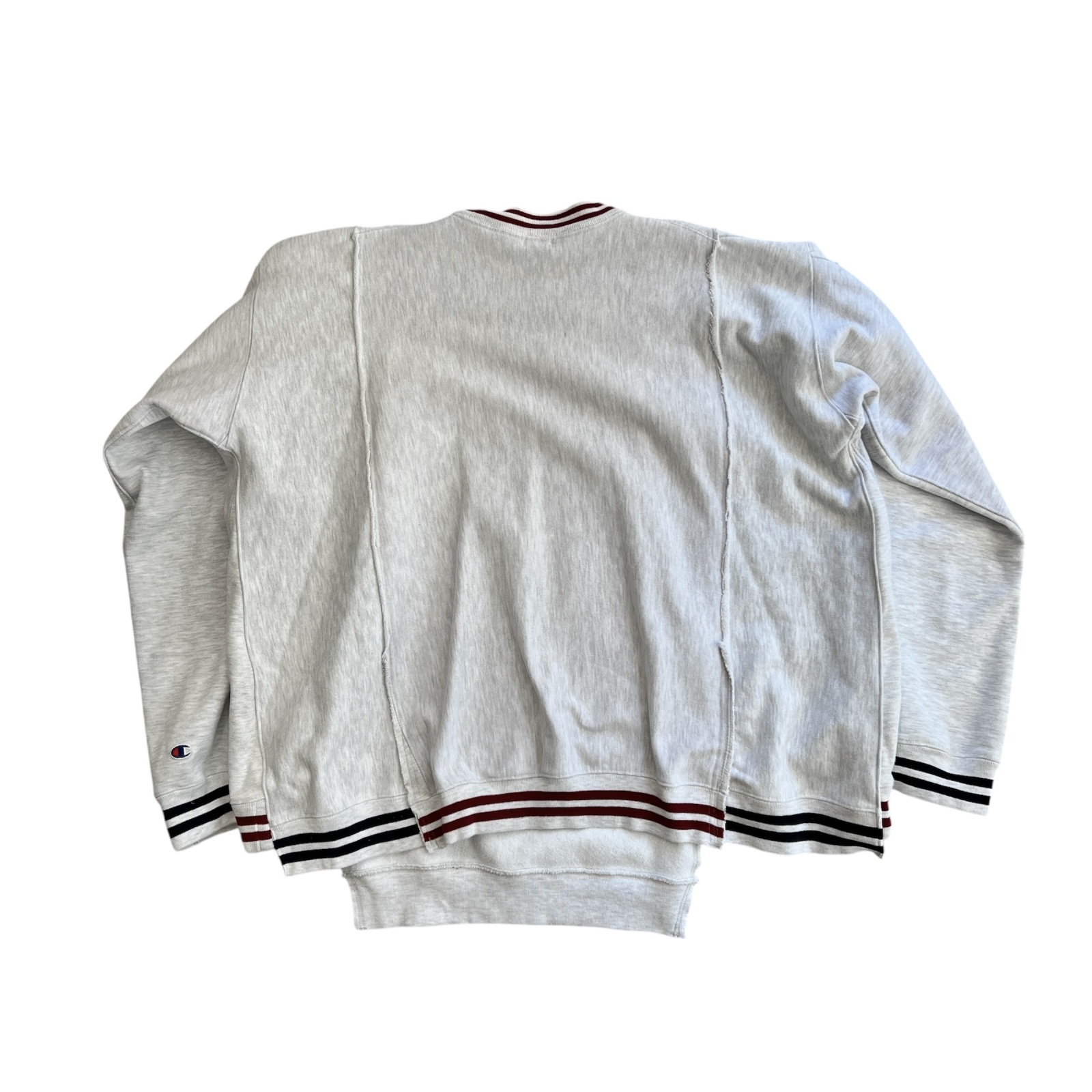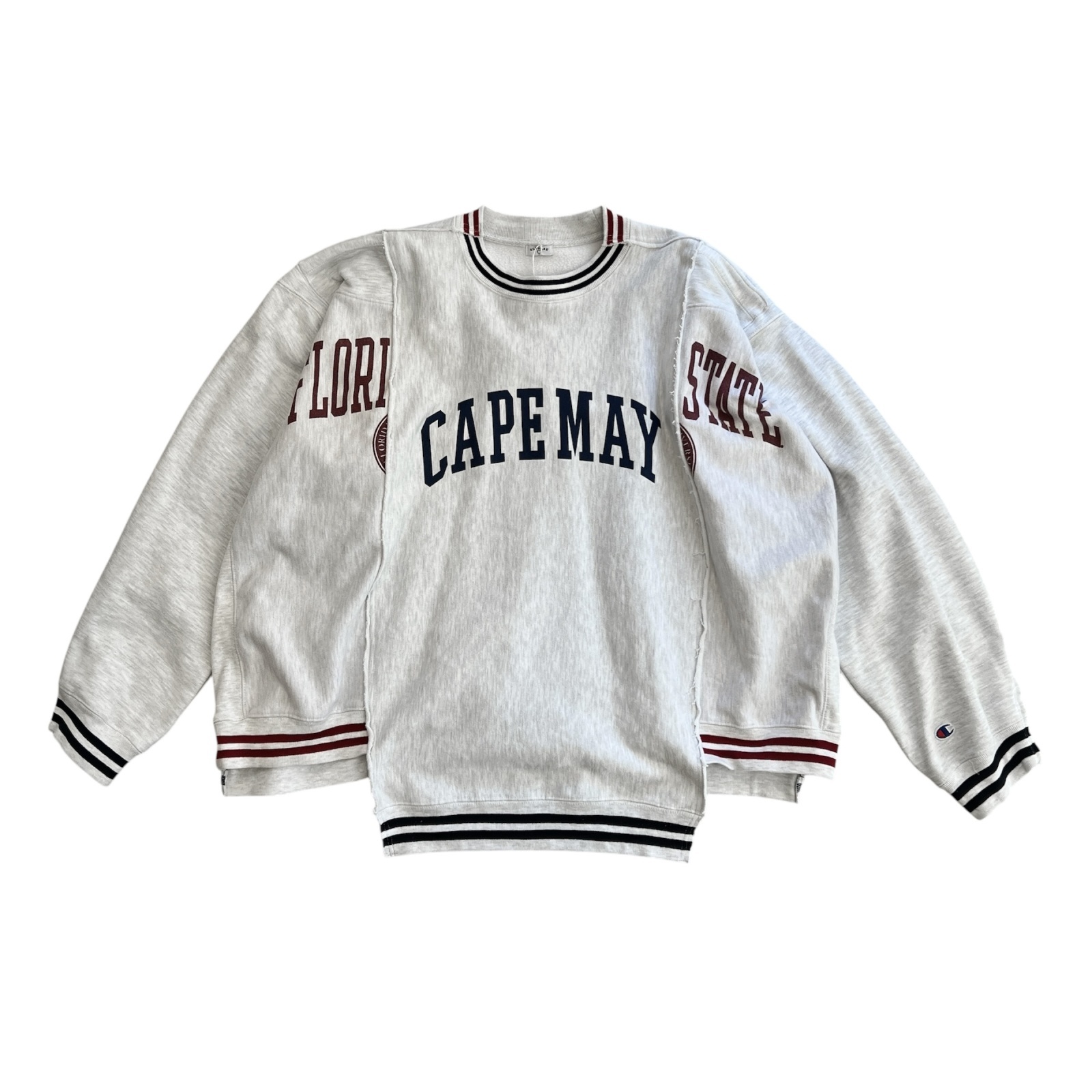2枚のスウェットシャツを複雑に繋ぎ合わせ、身幅にゆとりを持たせたルーズなワイドシルエット。