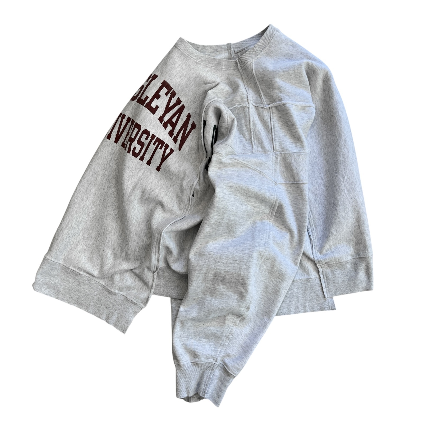 2枚のスウェットシャツを複雑に繋ぎ合わせ、身幅にゆとりを持たせたルーズなワイドシルエット。